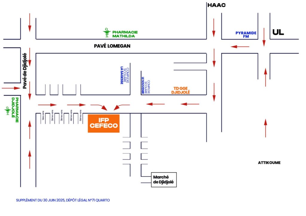 Pour y arriver chez nous au lieu de TD à DJIDJOLE (TD GGE-DJIDJOLE) ou au siège de IFP-CEFECO Sis à DJIDJOLE non loin de l’école primaire la sagesse et l’école privée laïc le souvenir.