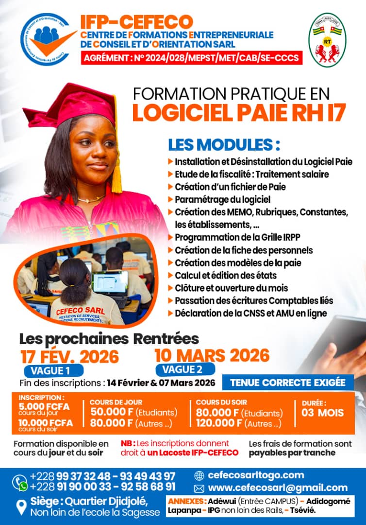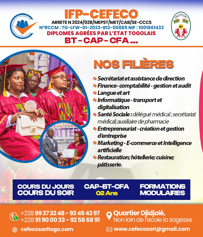Formations professionnelles au Togo : démarrez le 16 septembre 2025. Vous cherchez une formation professionnelle sérieuse et reconnue au Togo ? CEFECO SARL vous propose