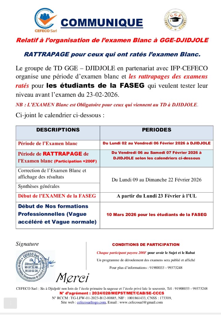 Les examens blancs FASEG 2026 ont officiellement débuté le lundi 02 février 2026 et se poursuivent jusqu’au samedi 07 février 2026 à Djidjolé. Cette initiative permet aux étudiants de tester leur niveau avant les examens universitaires et de mieux se préparer aux échéances académiques.