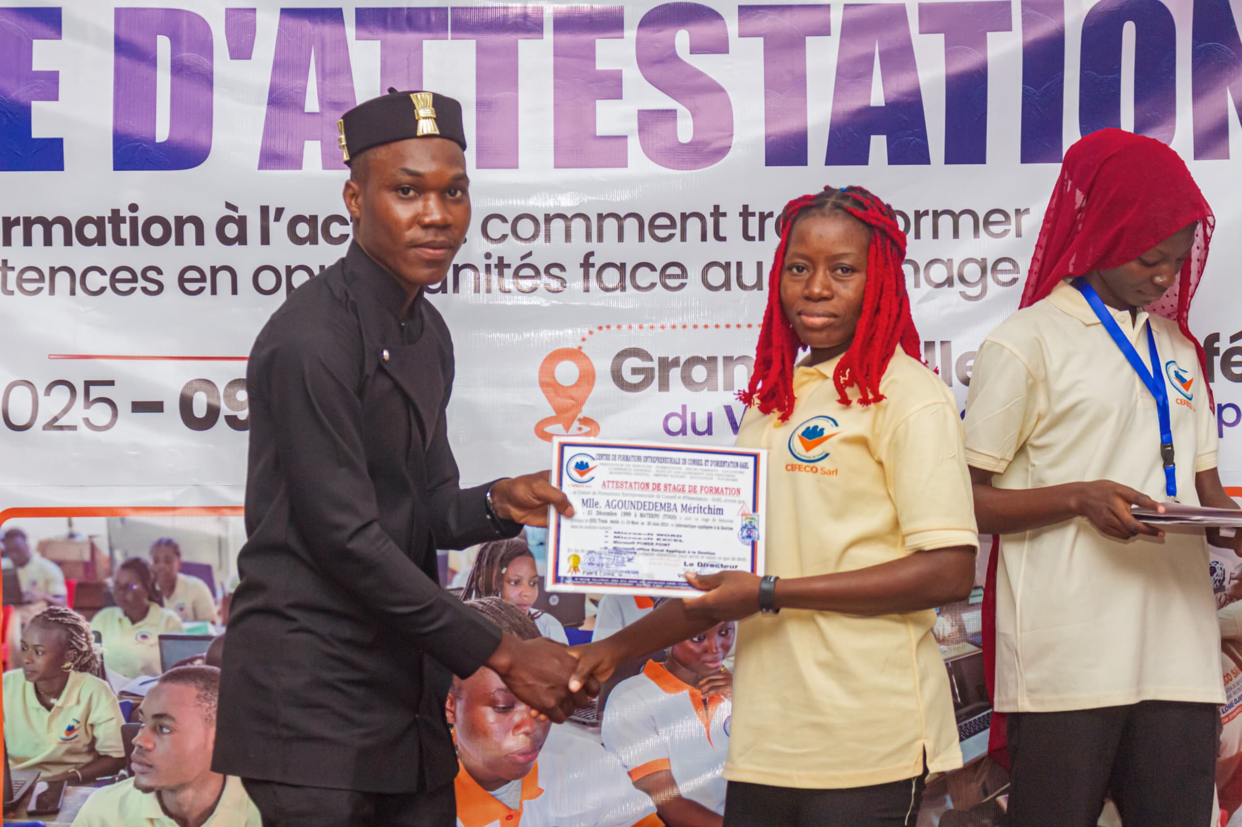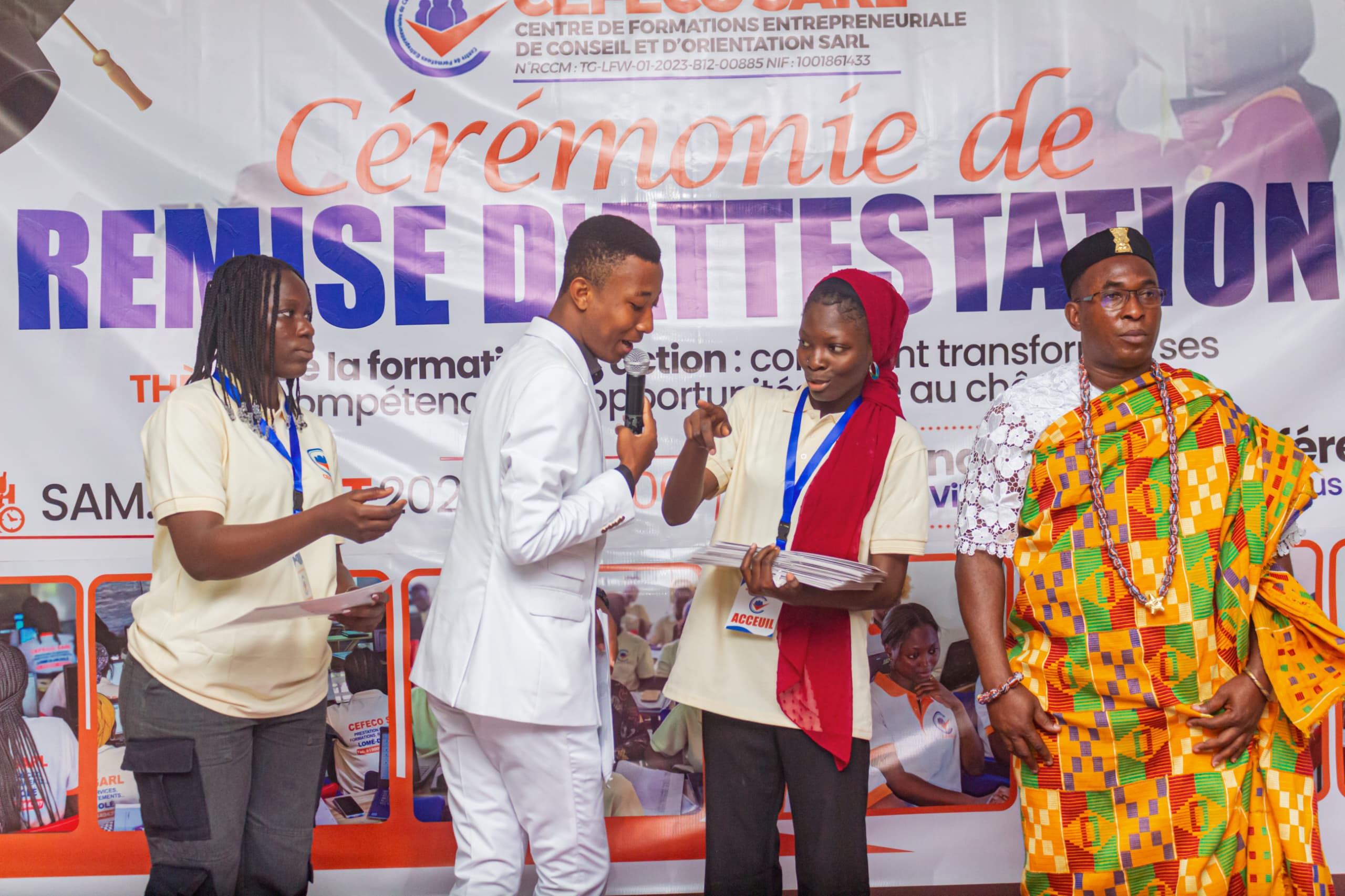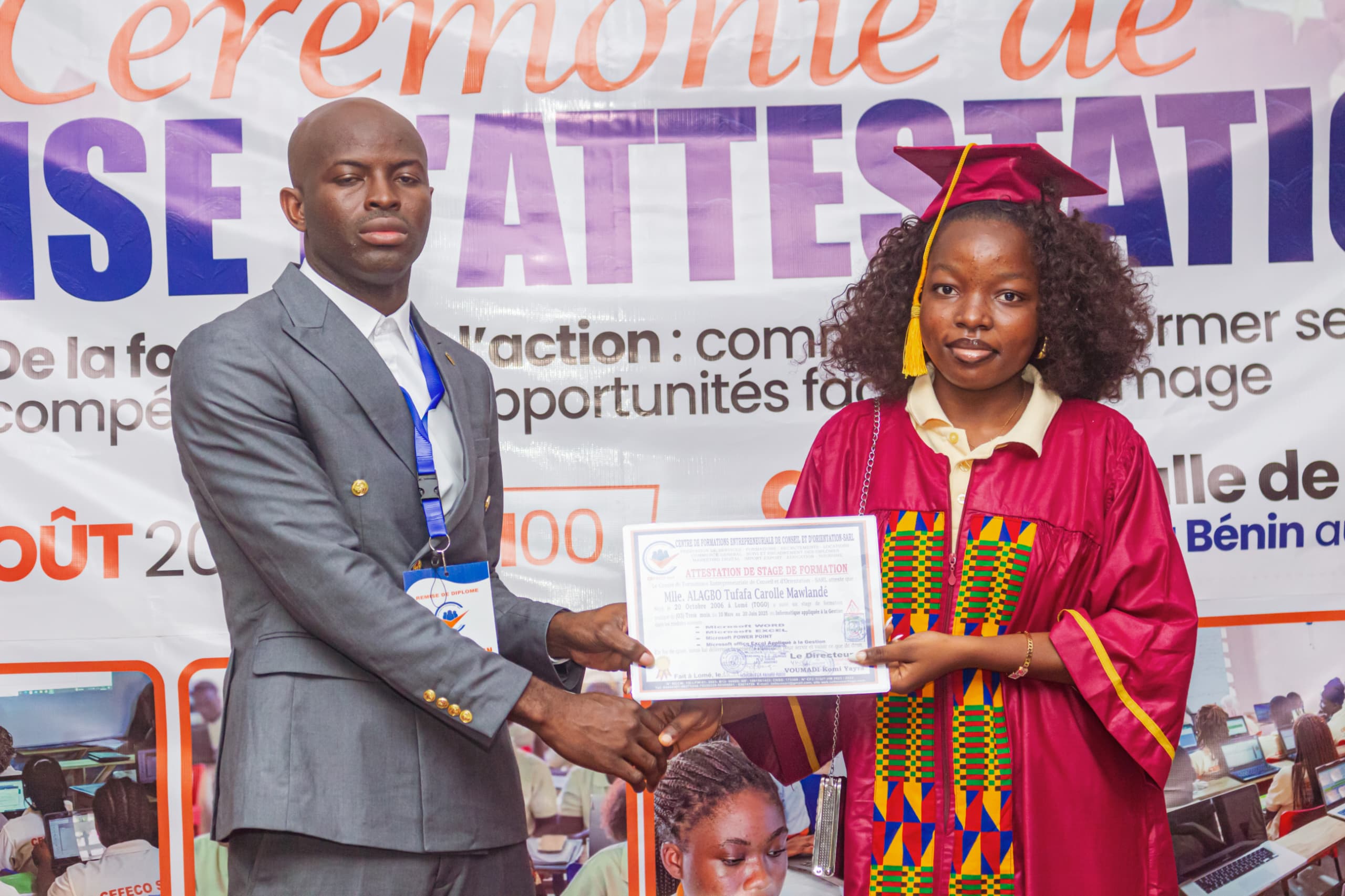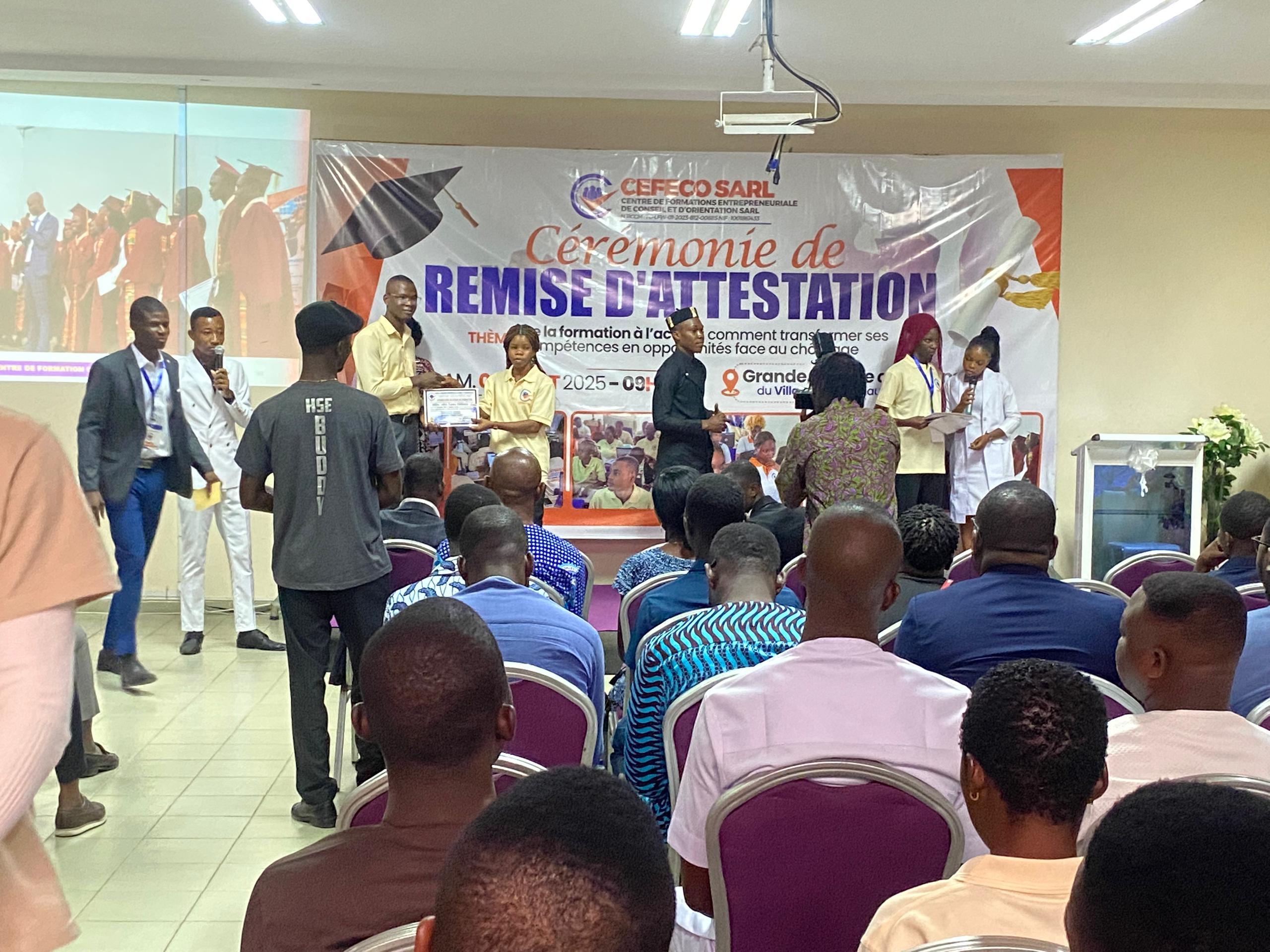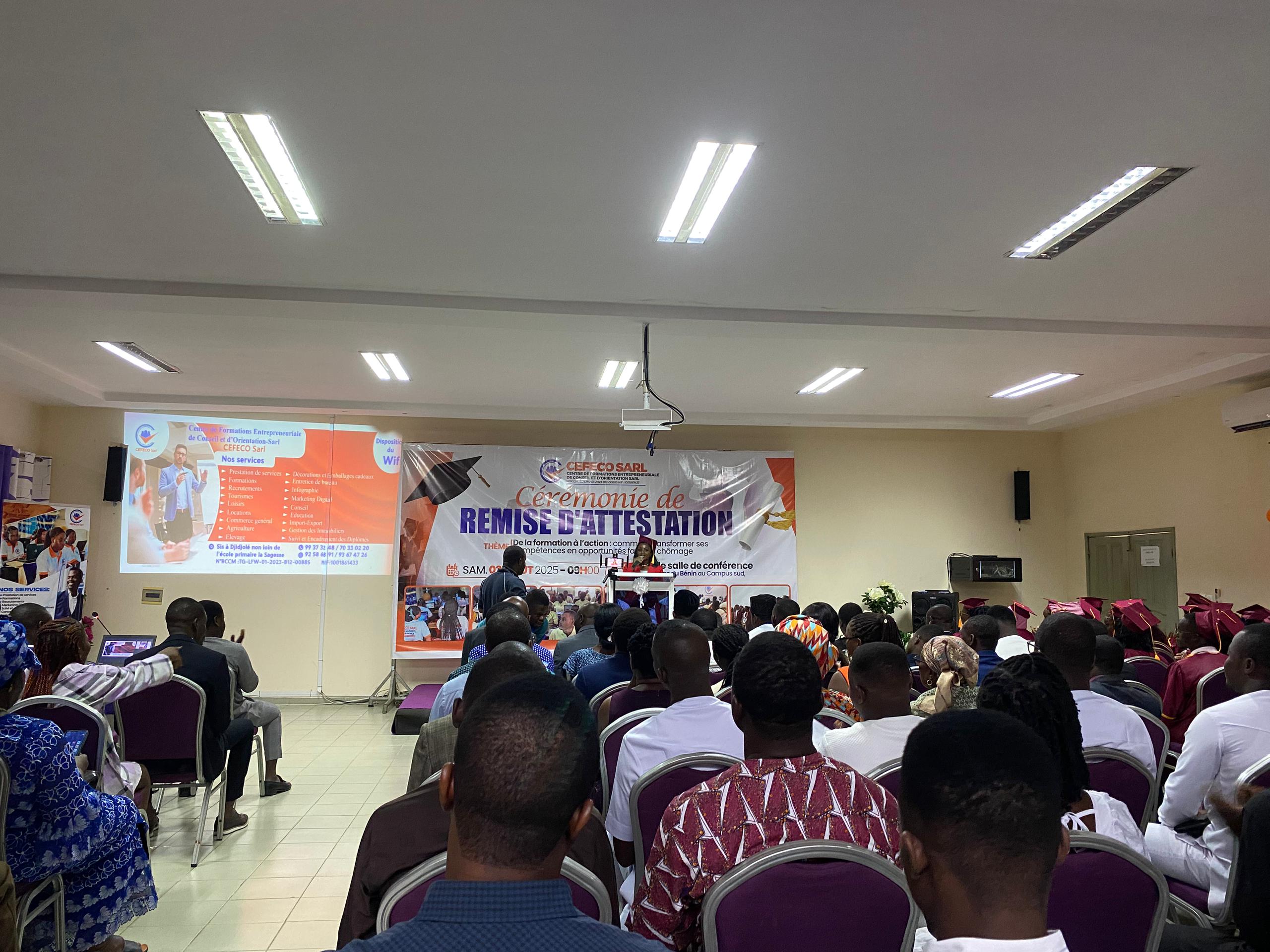 La cérémonie de remise d’attestations du Centre de Formations Entrepreneuriale de Conseil et d’Orientation SARL s’est tenue ce samedi 02 août 2025 dans la grande salle de conférence du Village du Bénin, au Campus Sud. Entre sourires, accolades et discours inspirants, cette journée a marqué l’aboutissement d’un parcours intense pour nos apprenants. Découvrez à travers ces photos l’ambiance festive et l’émotion palpable qui ont rythmé cet événement exceptionnel.