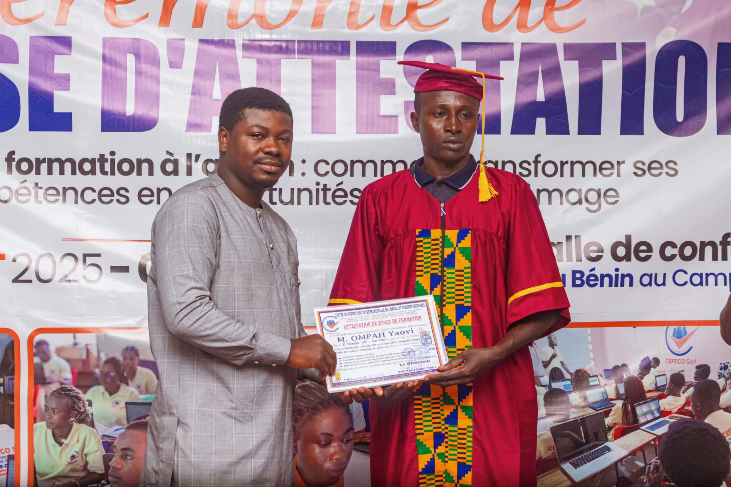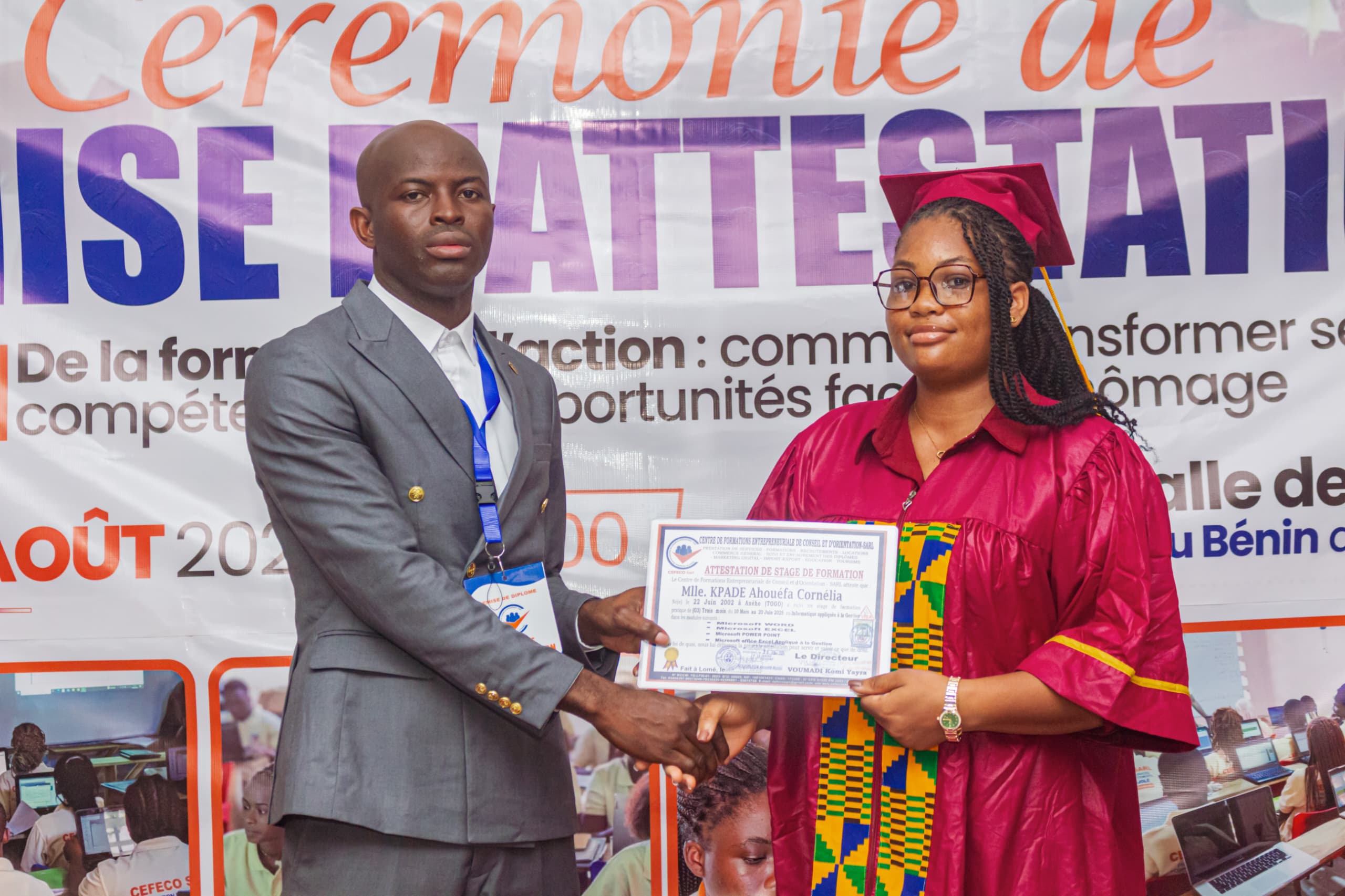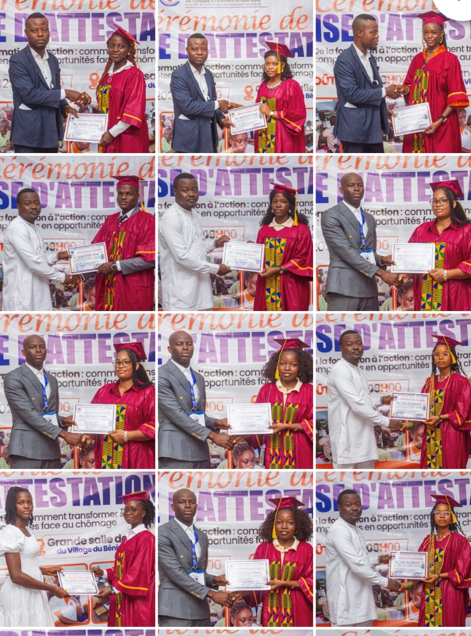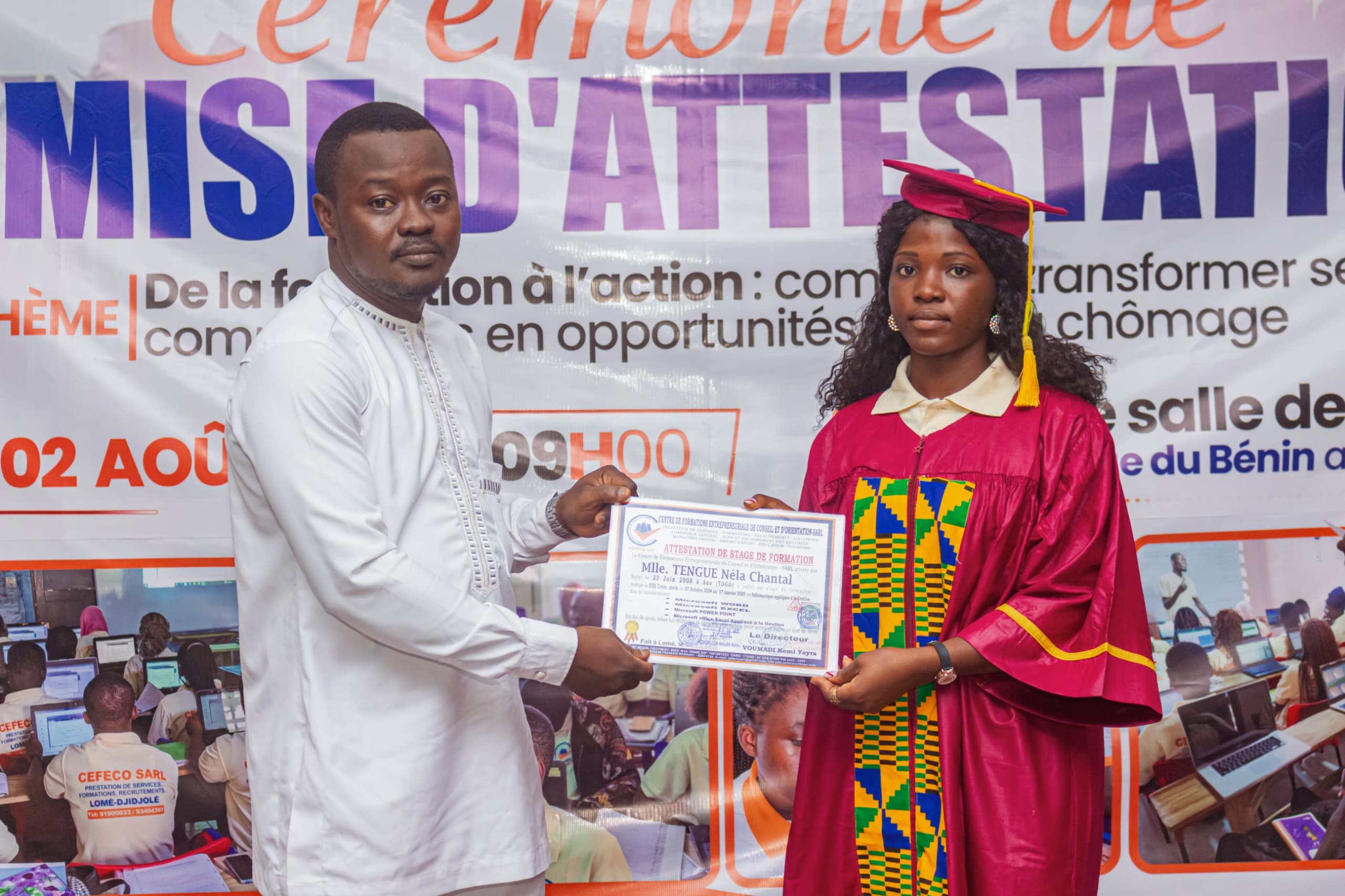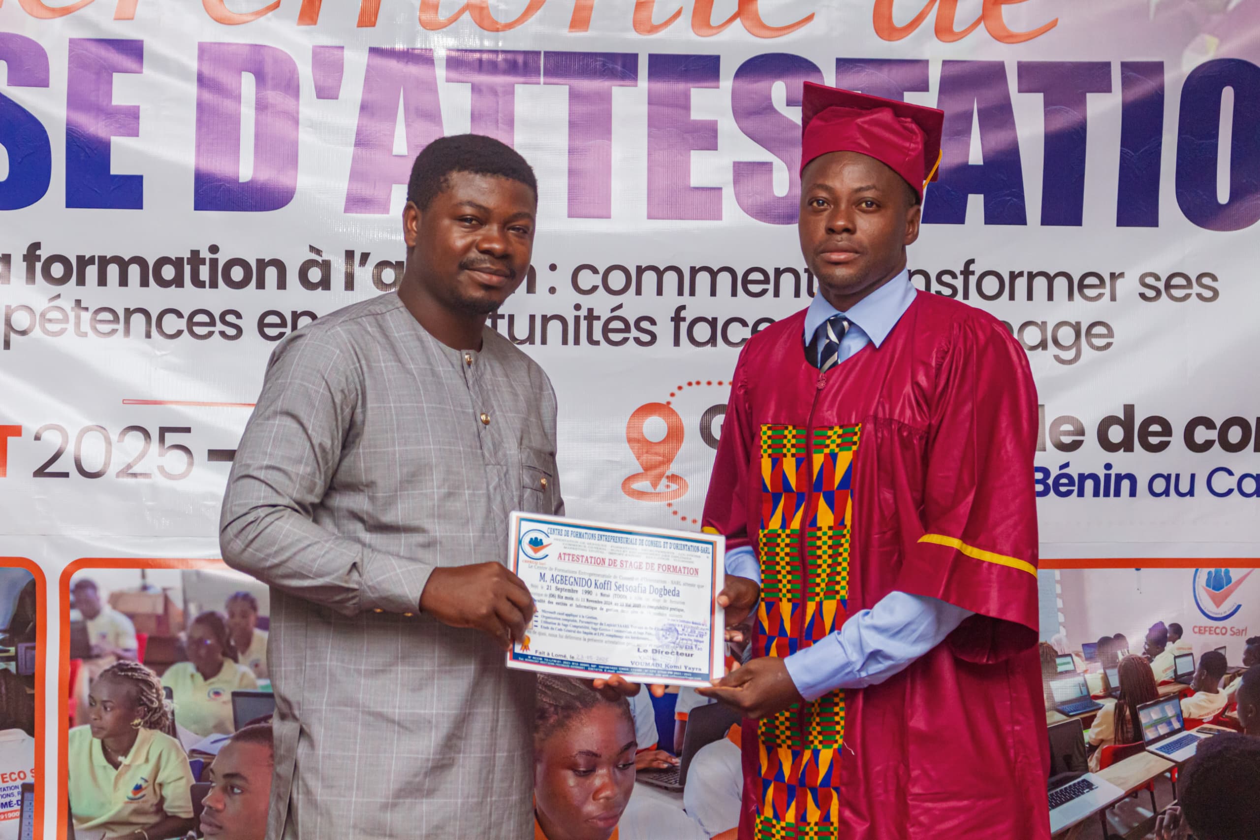 La cérémonie de remise d’attestations du Centre de Formations Entrepreneuriale de Conseil et d’Orientation SARL s’est tenue ce samedi 02 août 2025 dans la grande salle de conférence du Village du Bénin, au Campus Sud. Entre sourires, accolades et discours inspirants, cette journée a marqué l’aboutissement d’un parcours intense pour nos apprenants. Découvrez à travers ces photos l’ambiance festive et l’émotion palpable qui ont rythmé cet événement exceptionnel.