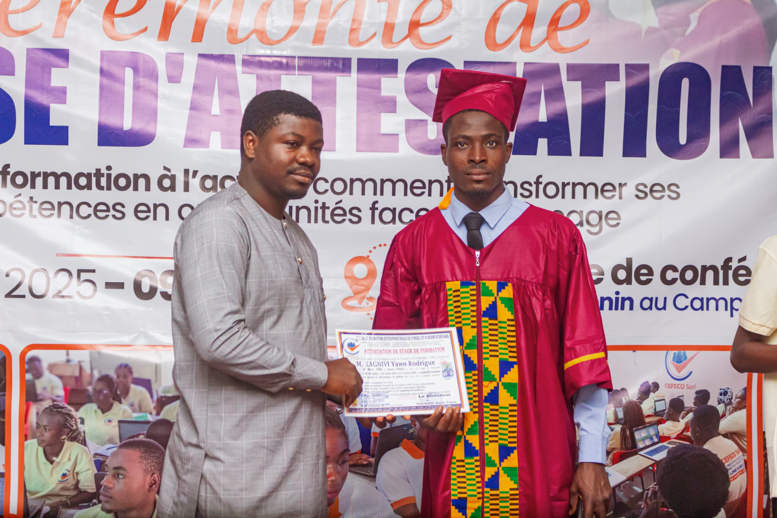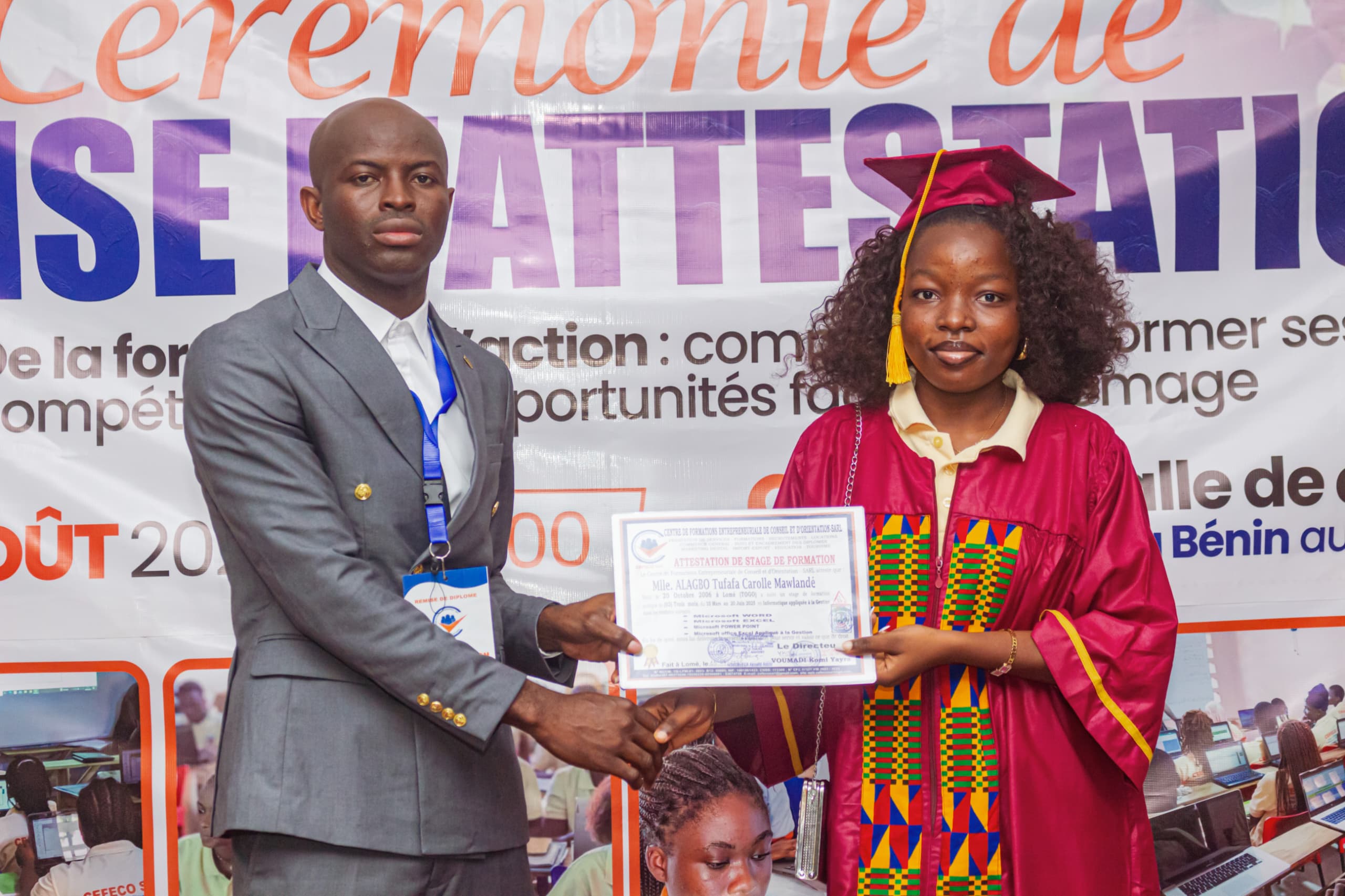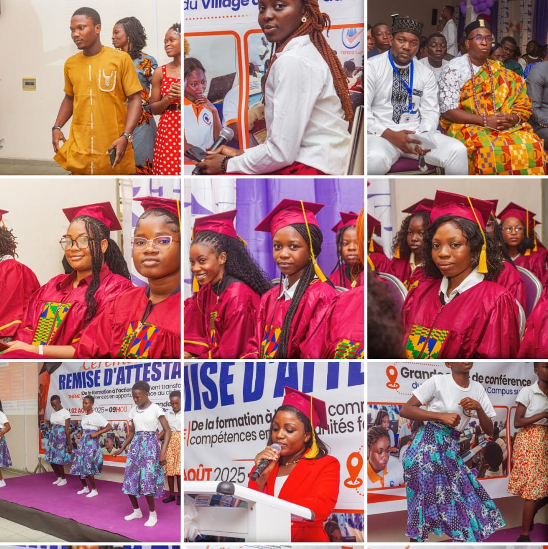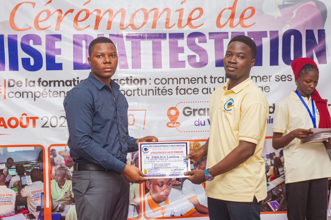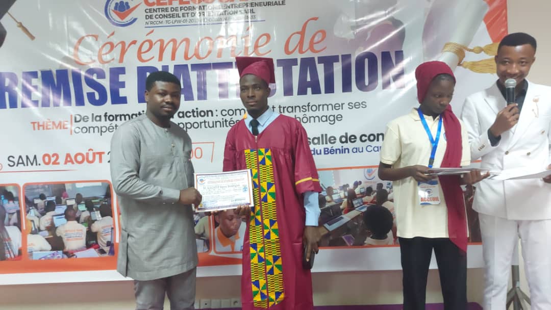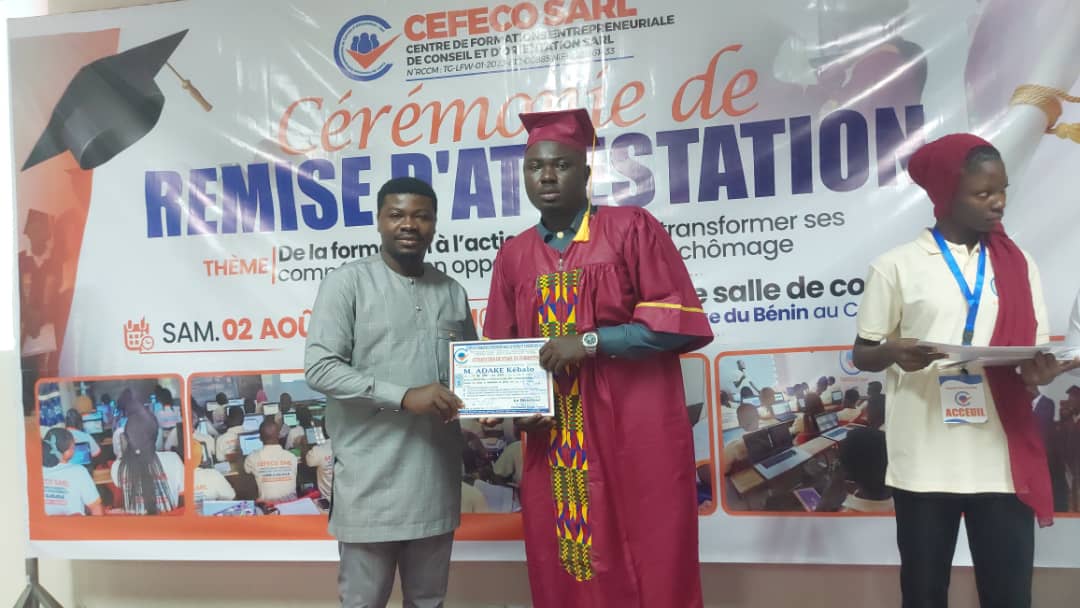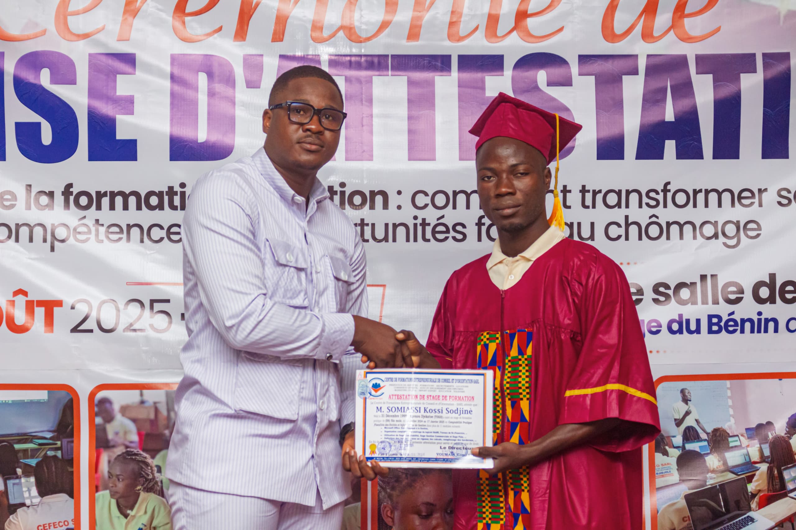 La cérémonie de remise d’attestations du Centre de Formations Entrepreneuriale de Conseil et d’Orientation SARL s’est tenue ce samedi 02 août 2025 dans la grande salle de conférence du Village du Bénin, au Campus Sud. Entre sourires, accolades et discours inspirants, cette journée a marqué l’aboutissement d’un parcours intense pour nos apprenants. Découvrez à travers ces photos l’ambiance festive et l’émotion palpable qui ont rythmé cet événement exceptionnel.