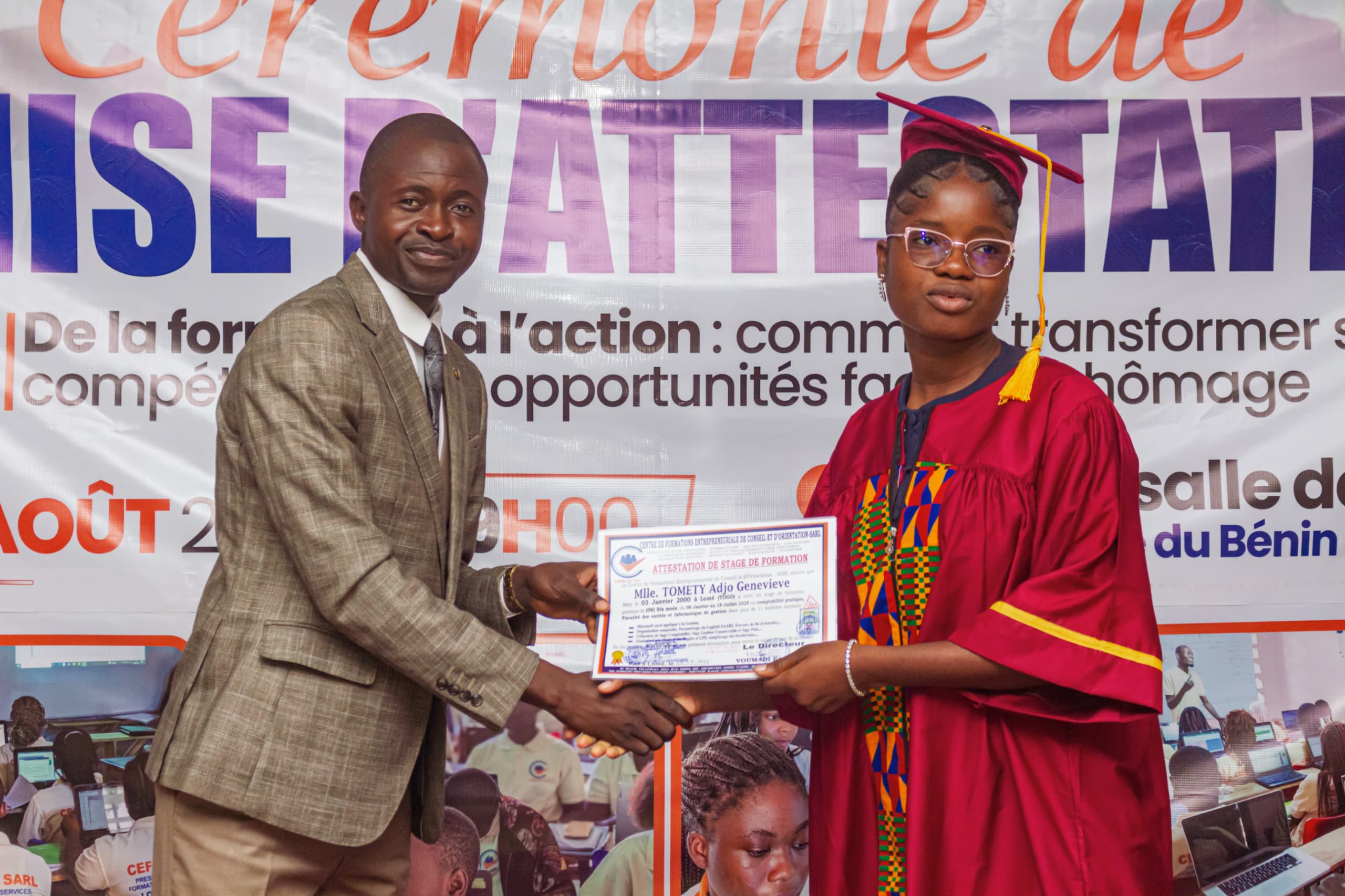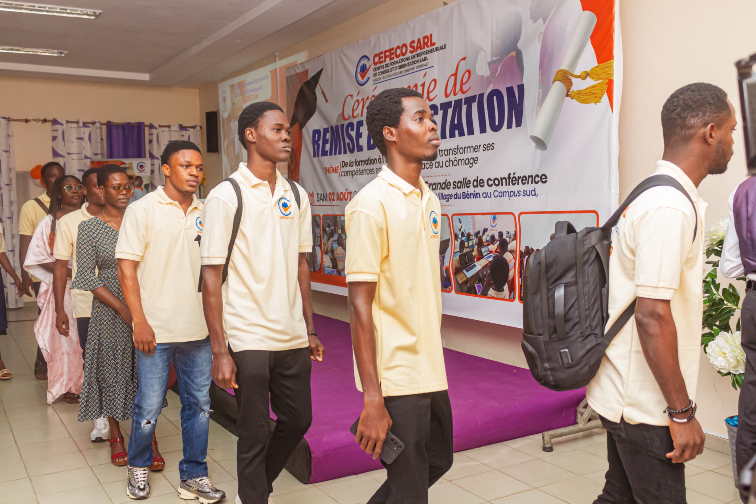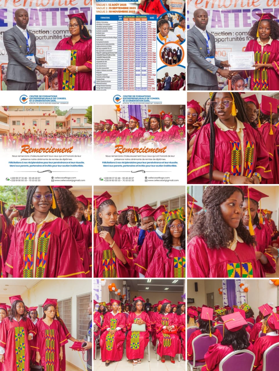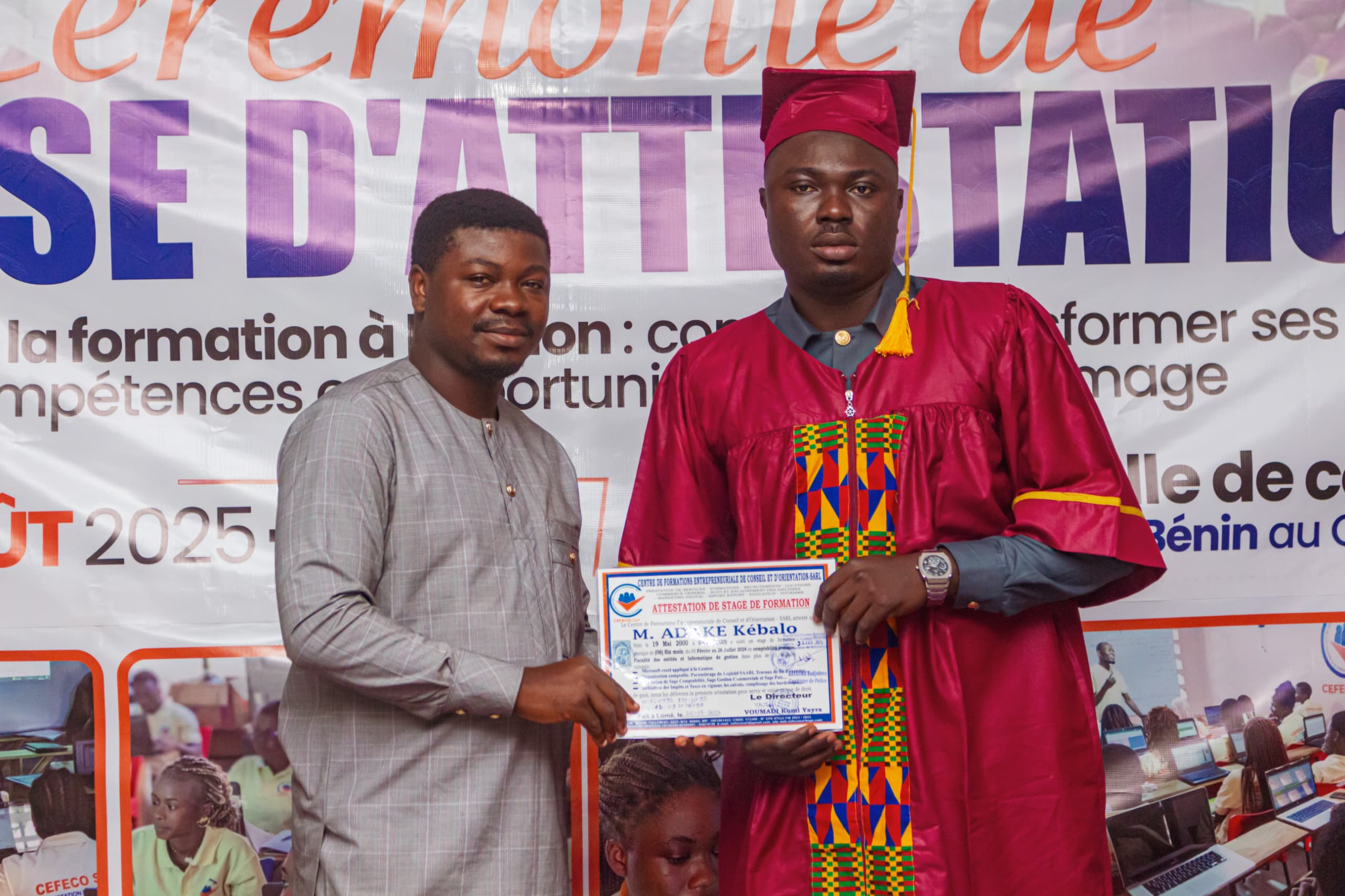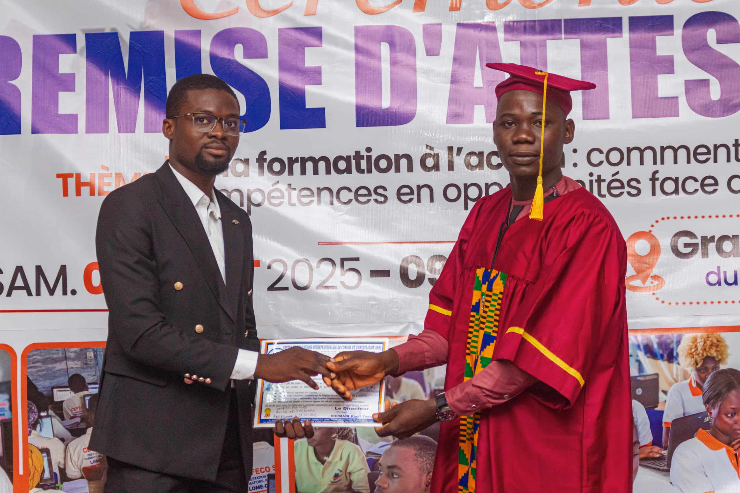 La cérémonie de remise d’attestations du Centre de Formations Entrepreneuriale de Conseil et d’Orientation SARL s’est tenue ce samedi 02 août 2025 dans la grande salle de conférence du Village du Bénin, au Campus Sud. Entre sourires, accolades et discours inspirants, cette journée a marqué l’aboutissement d’un parcours intense pour nos apprenants. Découvrez à travers ces photos l’ambiance festive et l’émotion palpable qui ont rythmé cet événement exceptionnel.