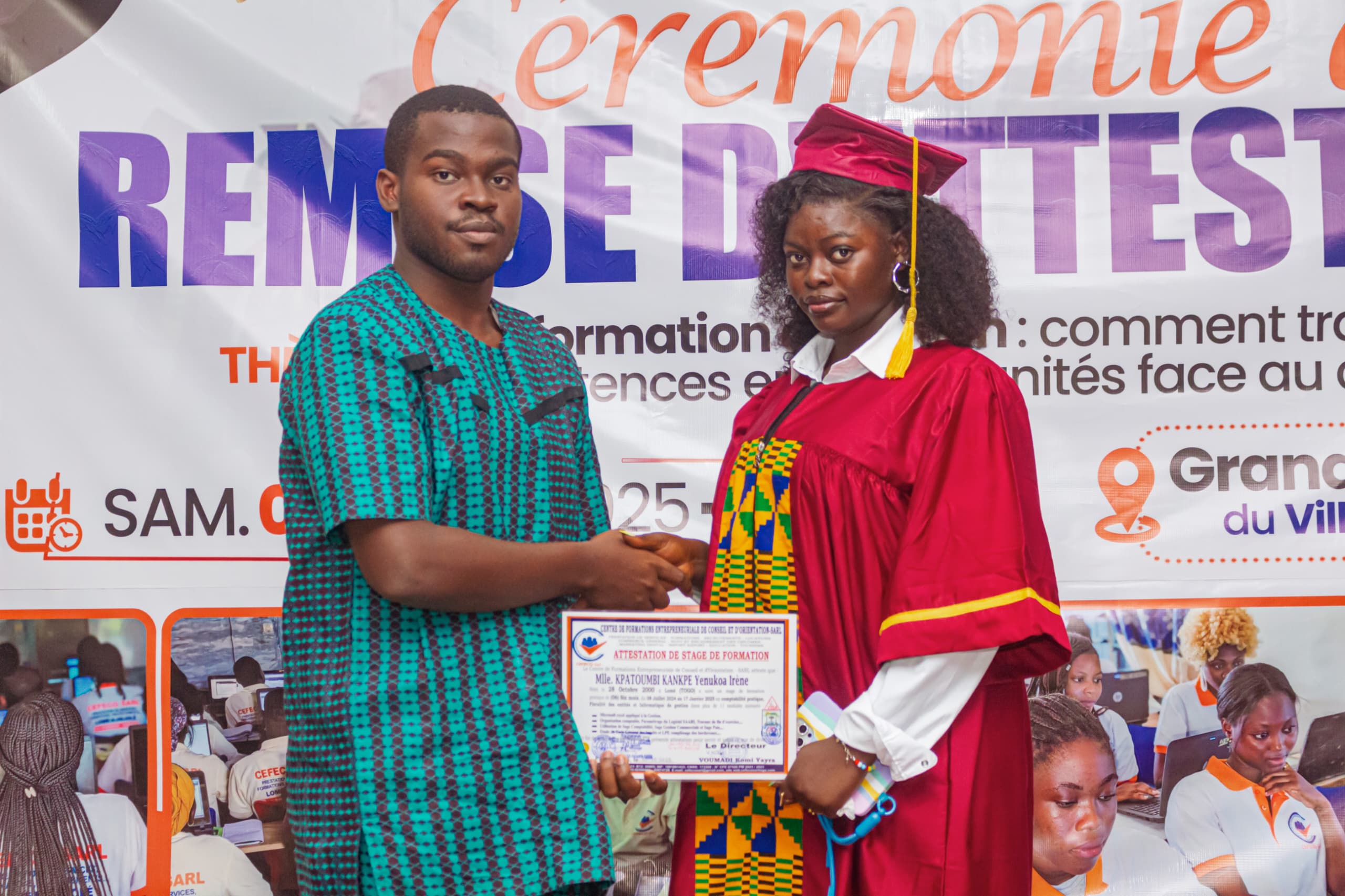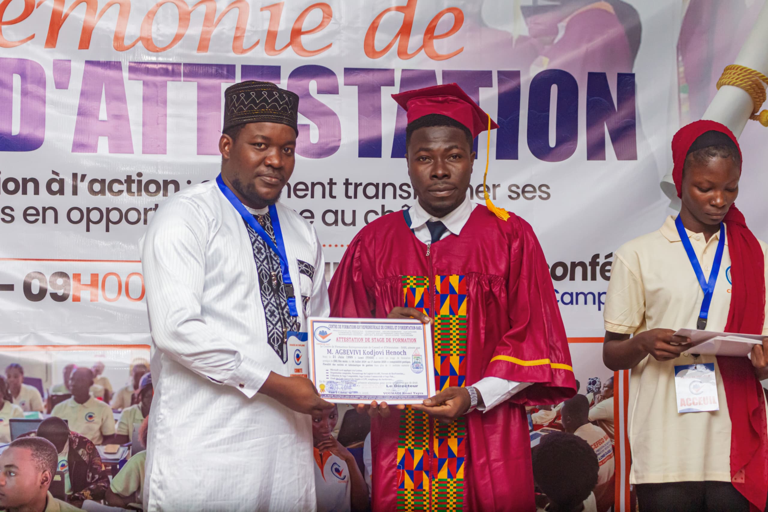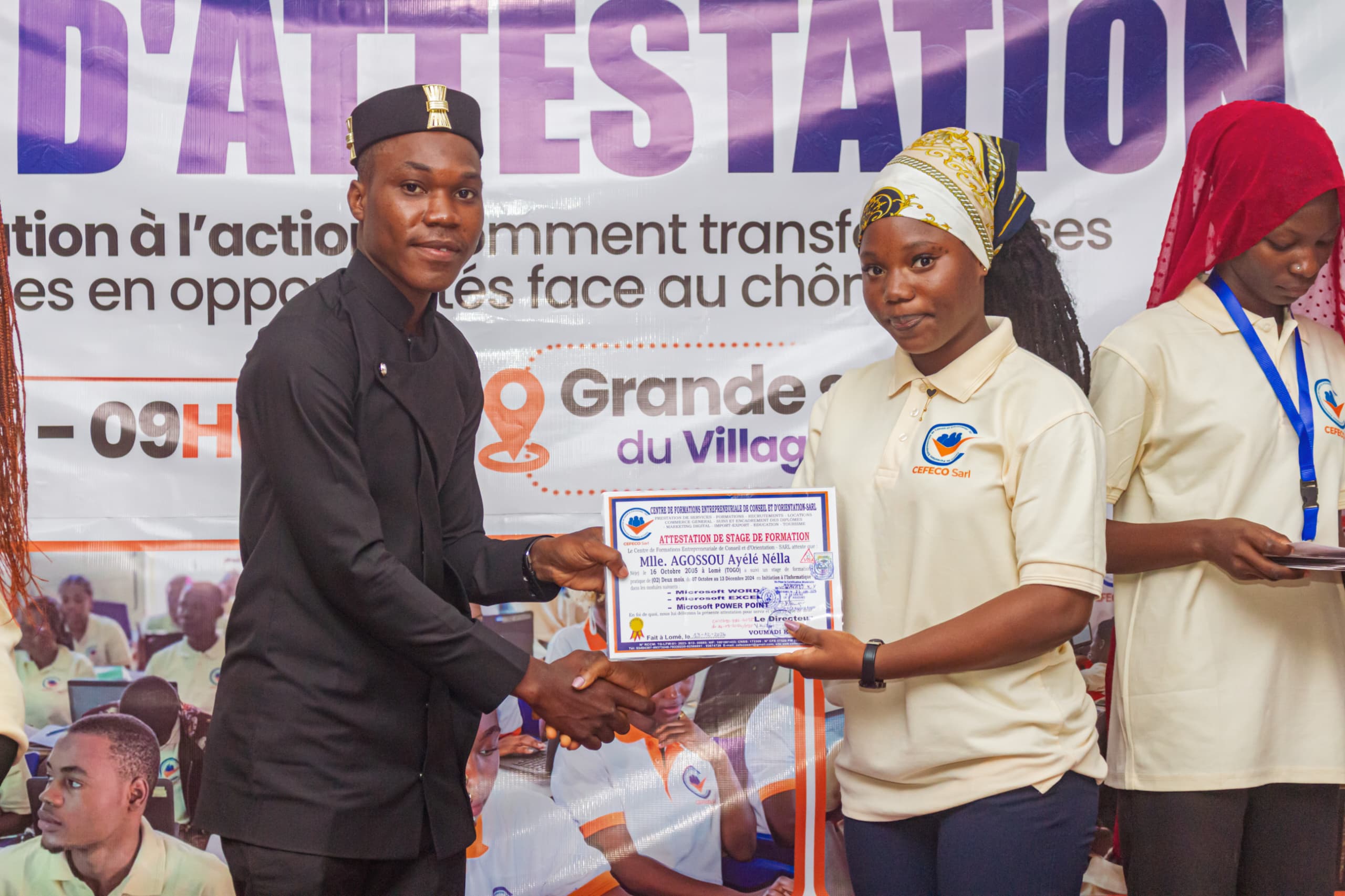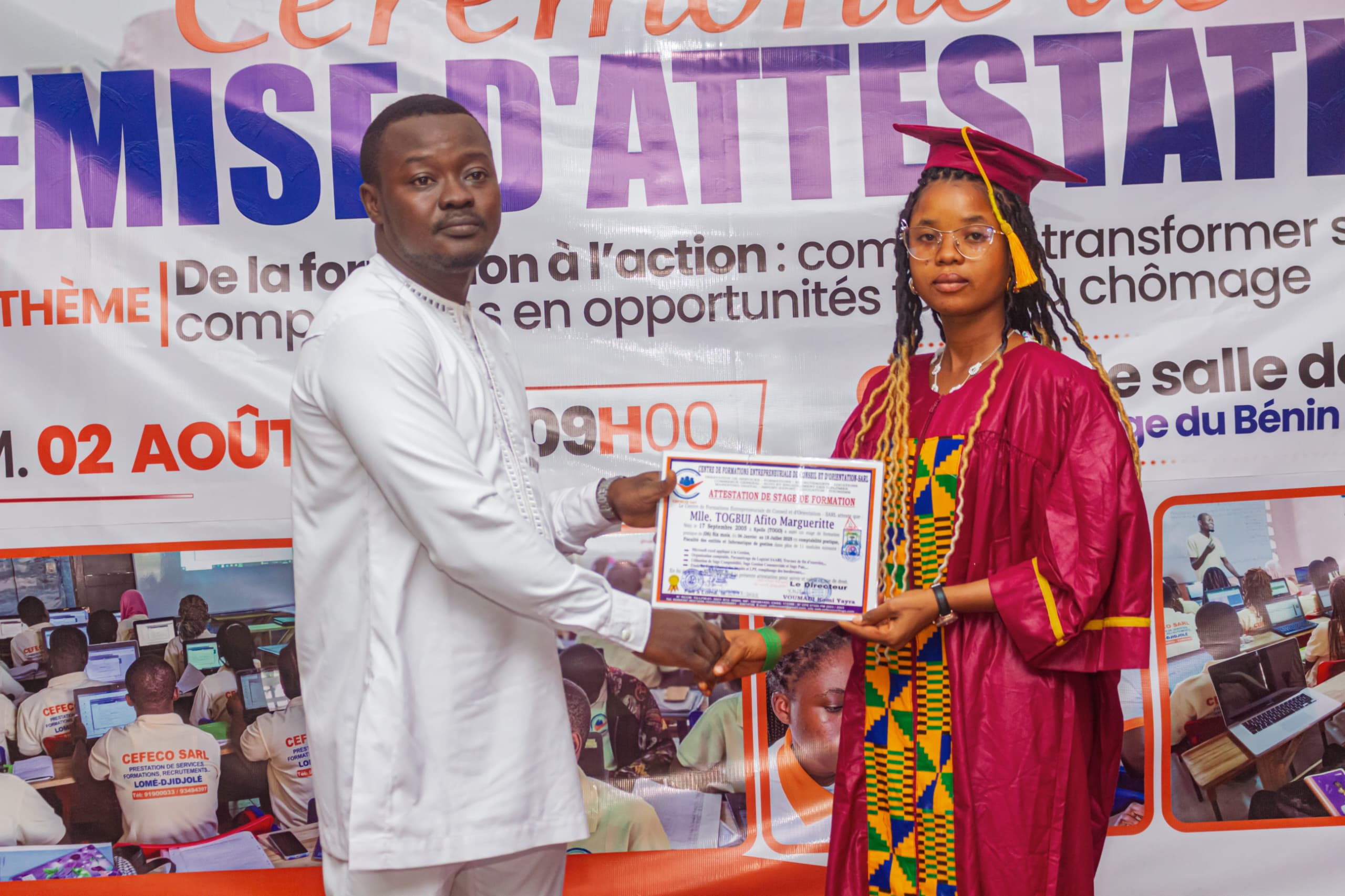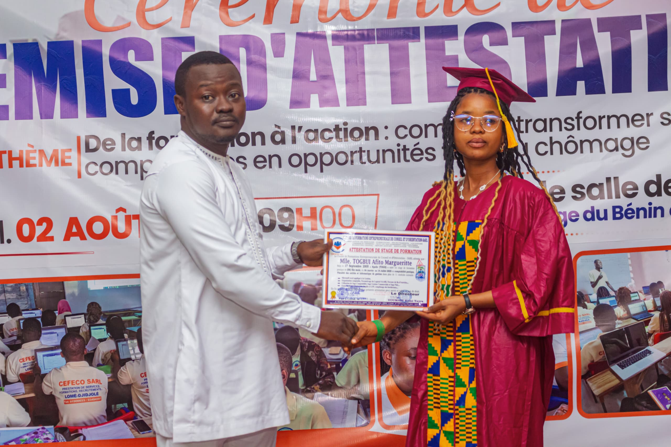 La cérémonie de remise d’attestations du Centre de Formations Entrepreneuriale de Conseil et d’Orientation SARL s’est tenue ce samedi 02 août 2025 dans la grande salle de conférence du Village du Bénin, au Campus Sud. Entre sourires, accolades et discours inspirants, cette journée a marqué l’aboutissement d’un parcours intense pour nos apprenants. Découvrez à travers ces photos l’ambiance festive et l’émotion palpable qui ont rythmé cet événement exceptionnel.