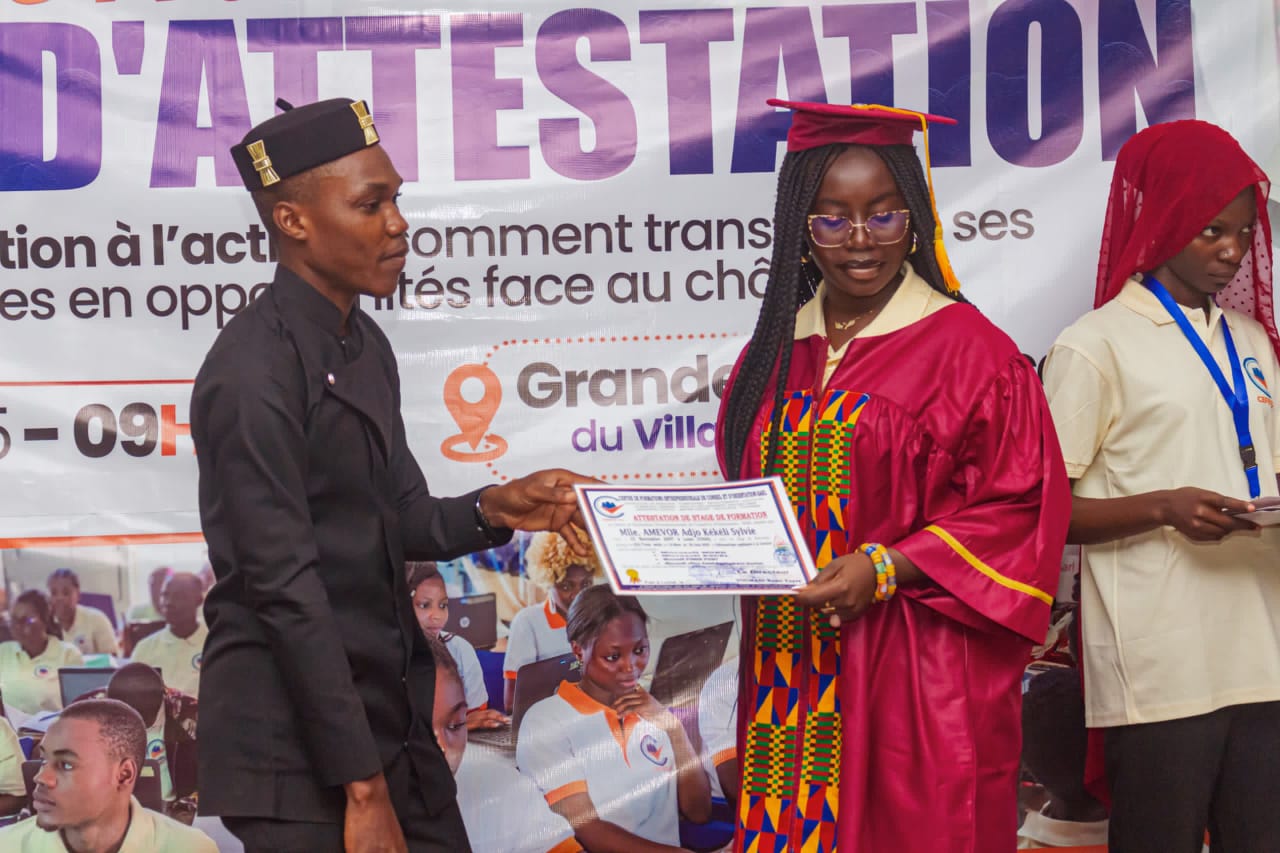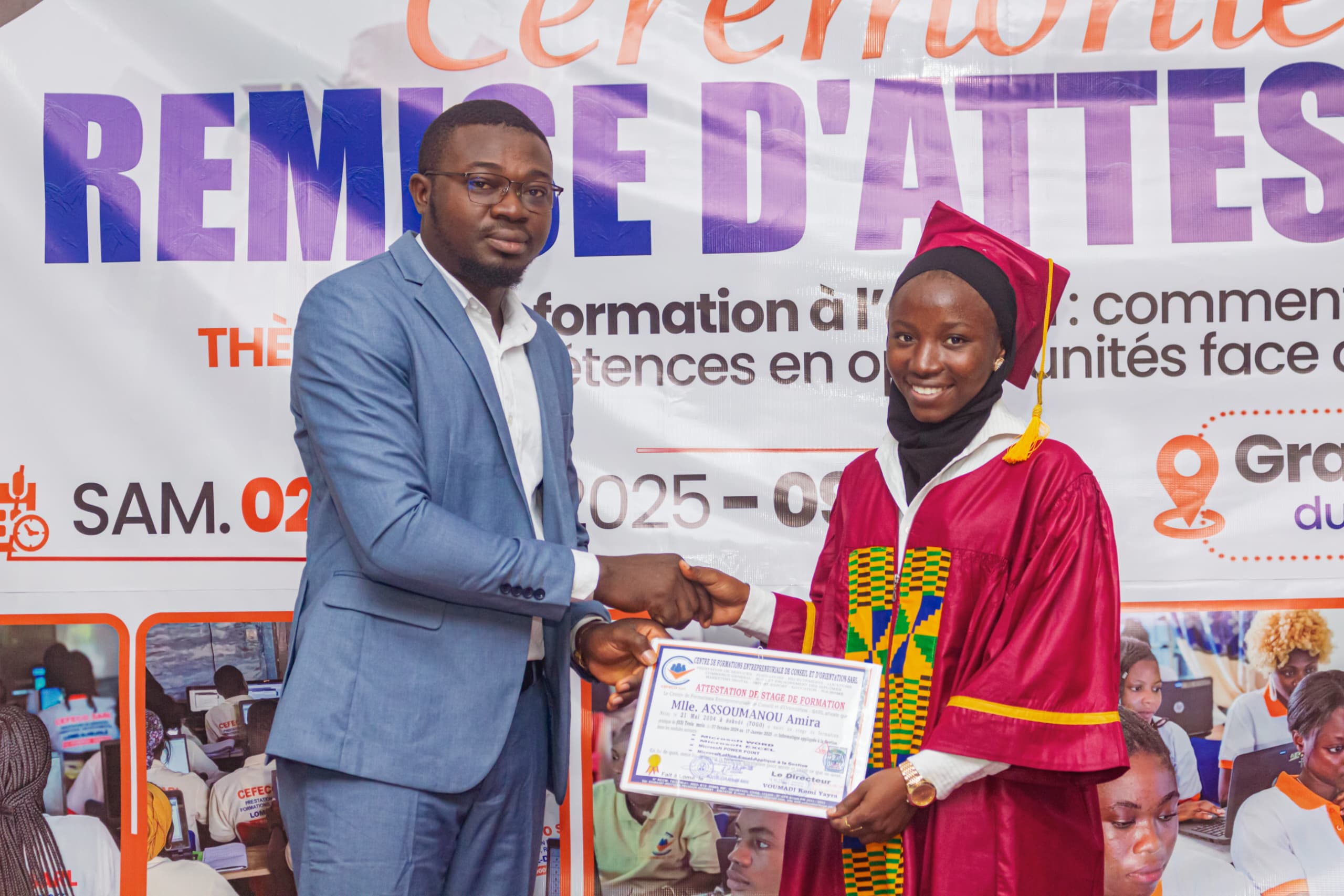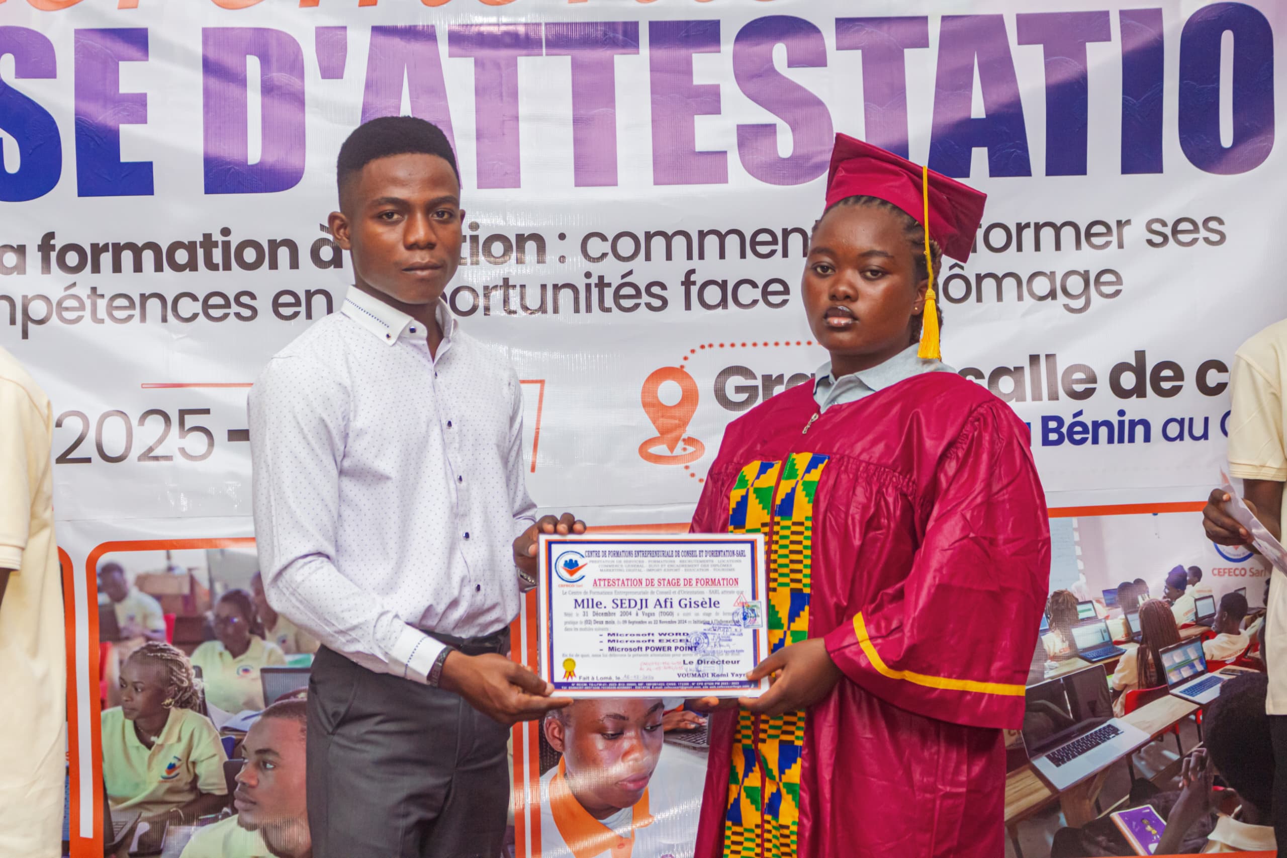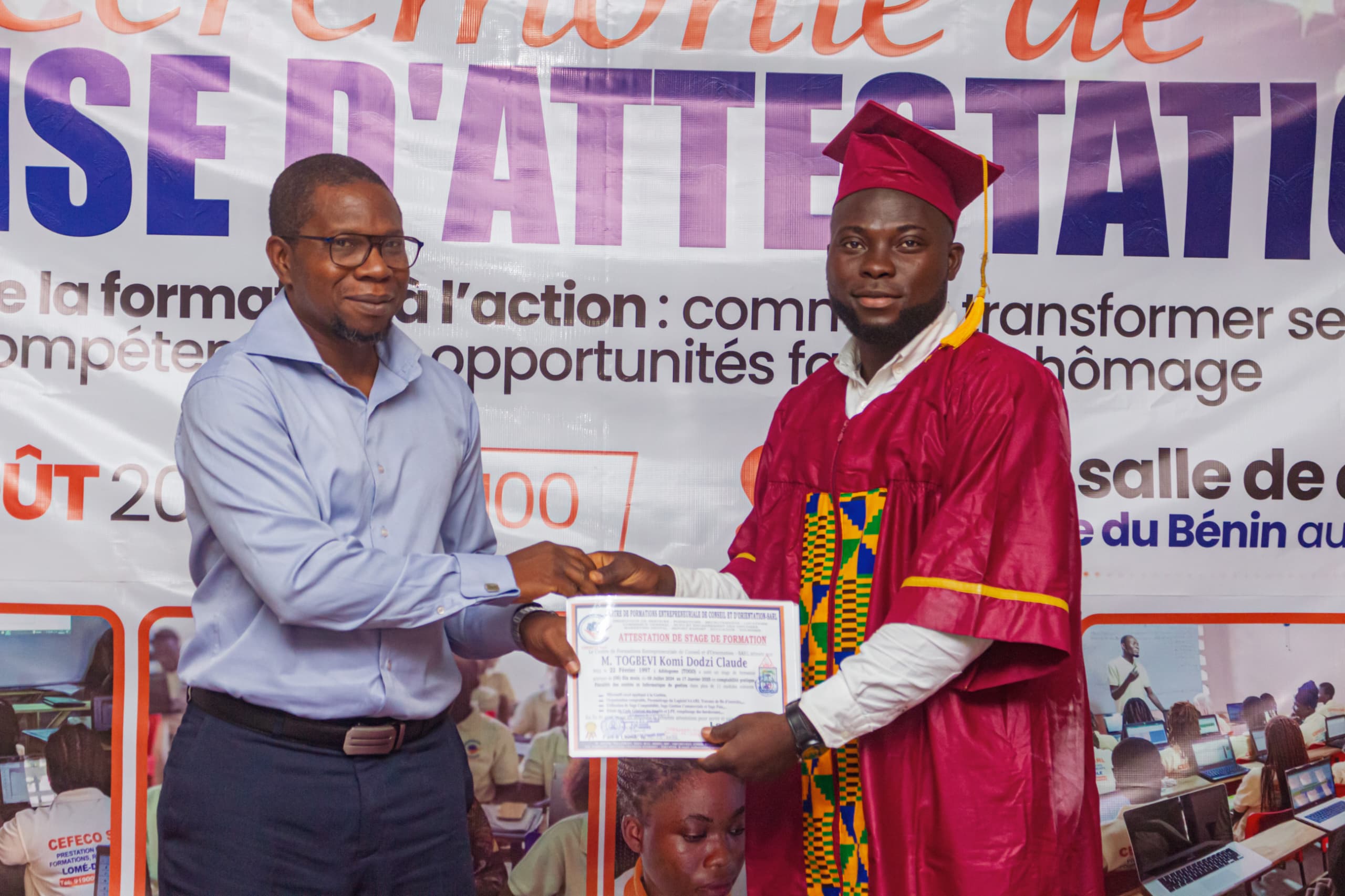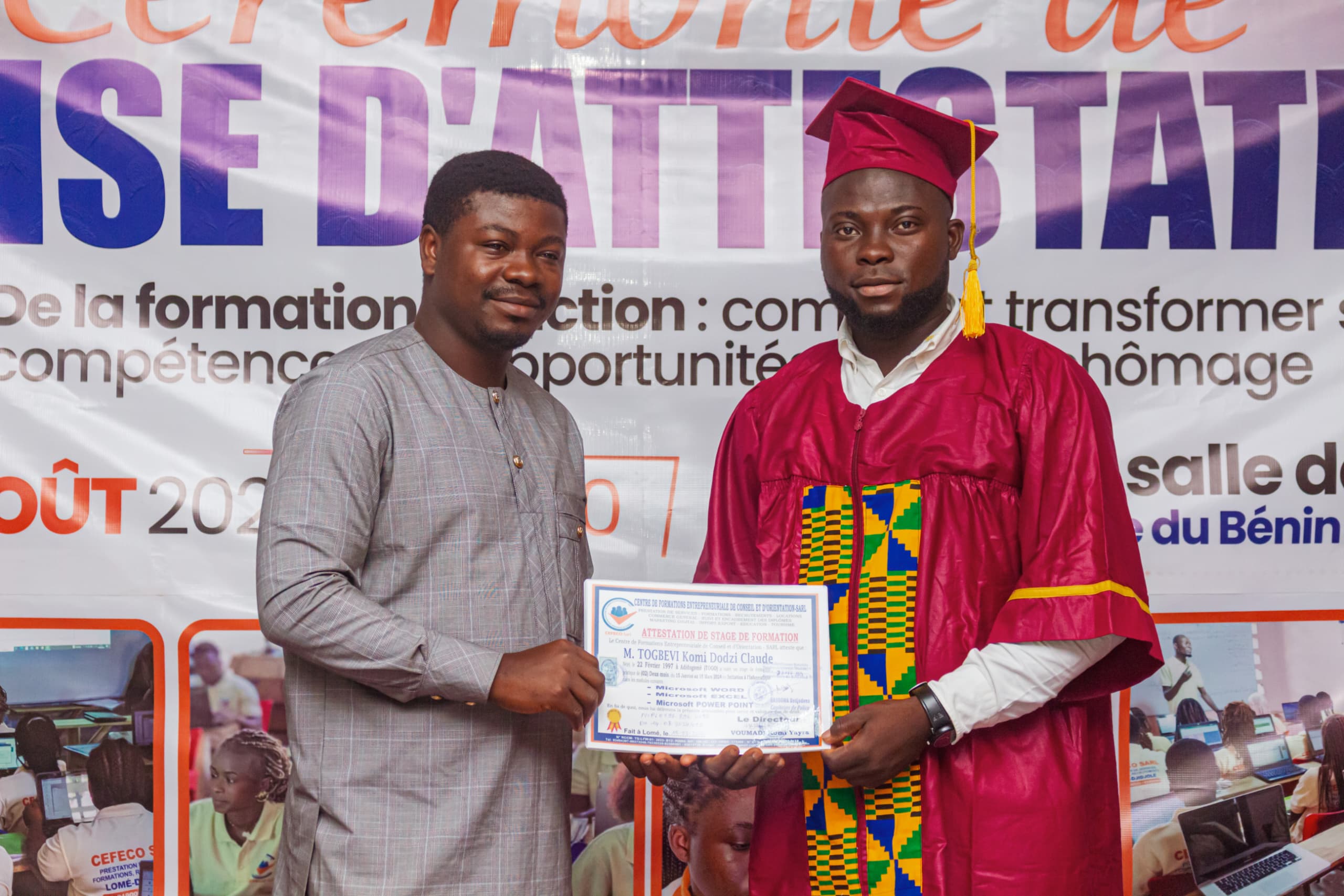 La cérémonie de remise d’attestations du Centre de Formations Entrepreneuriale de Conseil et d’Orientation SARL s’est tenue ce samedi 02 août 2025 dans la grande salle de conférence du Village du Bénin, au Campus Sud. Entre sourires, accolades et discours inspirants, cette journée a marqué l’aboutissement d’un parcours intense pour nos apprenants. Découvrez à travers ces photos l’ambiance festive et l’émotion palpable qui ont rythmé cet événement exceptionnel.